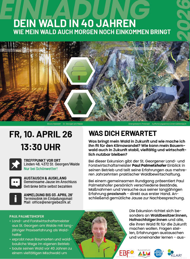 Bereits seit den 1980er-Jahren baut er seinen Wald schrittweise von Fichtenreinbeständen zu einem vielfältigen Mischwald um. Heute zeigt sein Betrieb eindrucksvoll, wie Waldumbau, Baumartenvielfalt und aktive Bewirtschaftung dazu beitragen können, Wälder widerstandsfähiger gegenüber dem Klimawandel zu machen. Bei einem gemeinsamen Rundgang durch verschiedene Bestände gibt Paul Palmetshofer Einblick in seine Erfahrungen aus mehreren Jahrzehnten Waldbewirtschaftung. Dabei werden konkrete Beispiele für Mischwald, Baumartenwahl, Waldpflege und klimafitte Forstwirtschaft vorgestellt.