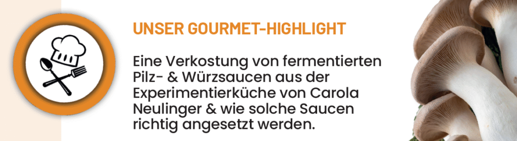 Am 14. Oktober 2025 von 18:30 bis 21:00 Uhr führt Seminarbäuerin Carola Neulinger durch einen genussvollen Abend, an dem die Teilnehmenden die vielfältigen Geschmacksnuancen der Edelpilze kennenlernen. Nach einer kurzen Einführung werden gemeinsam feine Pilzgerichte zubereitet und die wichtigsten Zubereitungsarten vorgestellt. Dabei zeigt sich, wie Pilze mit ausgewählten Gewürzen und Zutaten zu einem besonderen kulinarischen Erlebnis wie fermentierte Würzsaucen veredelt werden können.