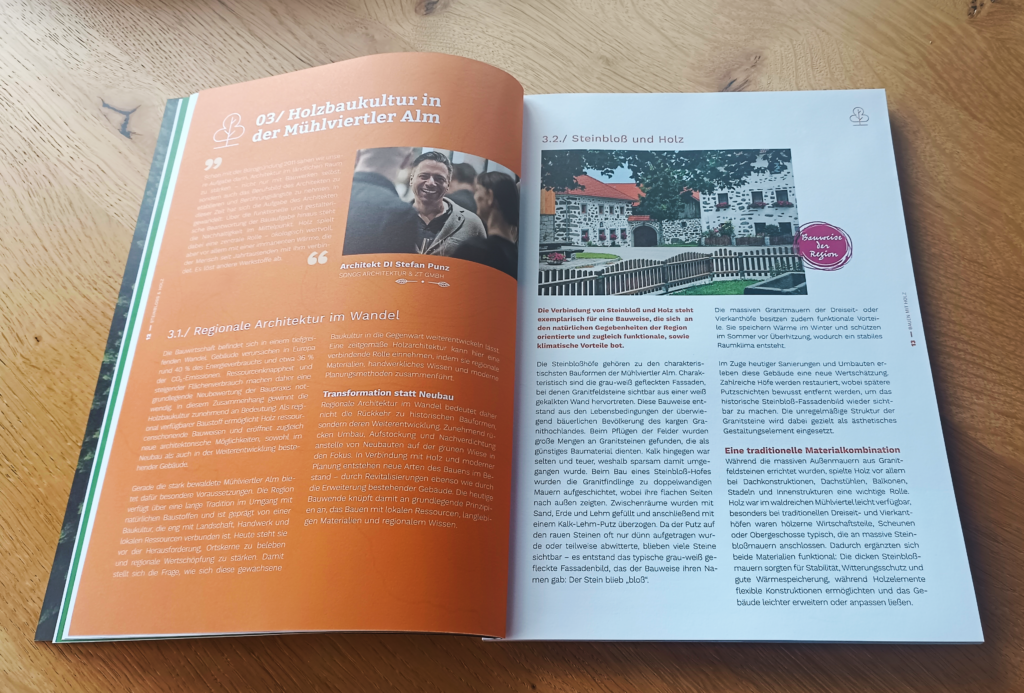 Den inhaltlichen Kern der Broschüre bilden 36 Projektbeispiele regionaler Holzwirtschaftsbetriebe, die sowohl architektonische Qualitäten als auch die hochwertige praktische Umsetzung sichtbar machen. Das 64-seitige Werk verfolgt dabei mehrere zentrale Zielsetzungen: Es soll den Holzbau in der Region stärken, die Zusammenhänge regionaler Wertschöpfungsketten am heimischen Holzmarkt aufzeigen, die Bedeutung des nachwachsenden Rohstoffs Holz – besonders in Zeiten der Energiekrise – hervorheben und einen wichtigen Beitrag zur langfristigen Imagebildung für die Ressource Holz in der Mühlviertler Alm leisten.
