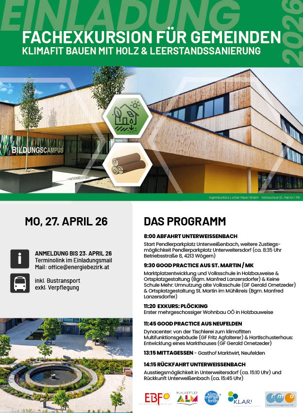 Im Rahmen der kommunalen Holzbauinitiative der Region Mühlviertler Alm findet am 27. April 2026 eine Fachexkursion zum Thema „Klimafit bauen mit Holz & Leerstandssanierung“ in den Bezirk Rohrbach statt. Die Veranstaltung richtet sich an politische Entscheidungsträger:innen, Verwaltung, Gemeindemitarbeiter:innen sowie interessierte Ausschüsse im Bezirk Freistadt und baut auf der langjährigen regionalen Auseinandersetzung mit Holzbau, Innenentwicklung und Leerstandsnachnutzung auf.