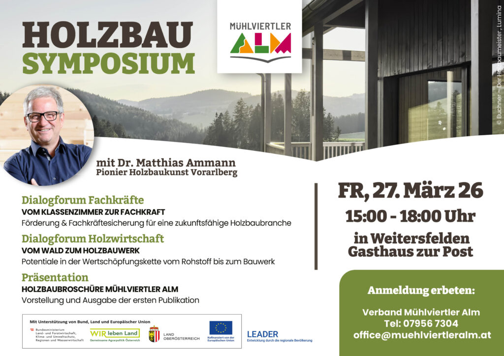 Ein besonderer Höhepunkt des Programms ist die Keynote von Dr. Matthias Ammann, Mitbegründer von HolzbauKunst Vorarlberg und einer der prägenden Persönlichkeiten hinter Holzbau Austria. Er gibt Einblicke in erfolgreiche Entwicklungen im Holzbau und zeigt auf, welche Chancen sich daraus für ländliche Regionen ergeben. Im Rahmen des Symposiums wird außerdem die erste Holzbaubroschüre der Mühlviertler Alm präsentiert. Sie macht beispielhafte Projekte, regionales Know-how und die Vielfalt moderner Holzarchitektur in der Region sichtbar und unterstreicht das große Potenzial des Baustoffs Holz. Im Anschluss laden zwei Dialogforen zum gemeinsamen Austausch ein. Unter dem Titel „Vom Klassenzimmer zur Fachkraft“ stehen die Förderung des Nachwuchses und die Sicherung qualifizierter Fachkräfte in der Holzbranche im Mittelpunkt. Das zweite Forum, „Vom Wald zum Holzbauwerk“ beleuchtet die Potenziale entlang der gesamten Wertschöpfungskette – von der nachhaltigen Waldbewirtschaftung bis zum fertigen Bauwerk.