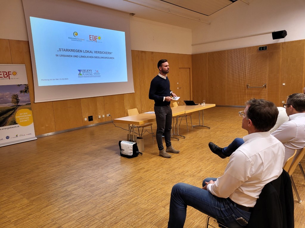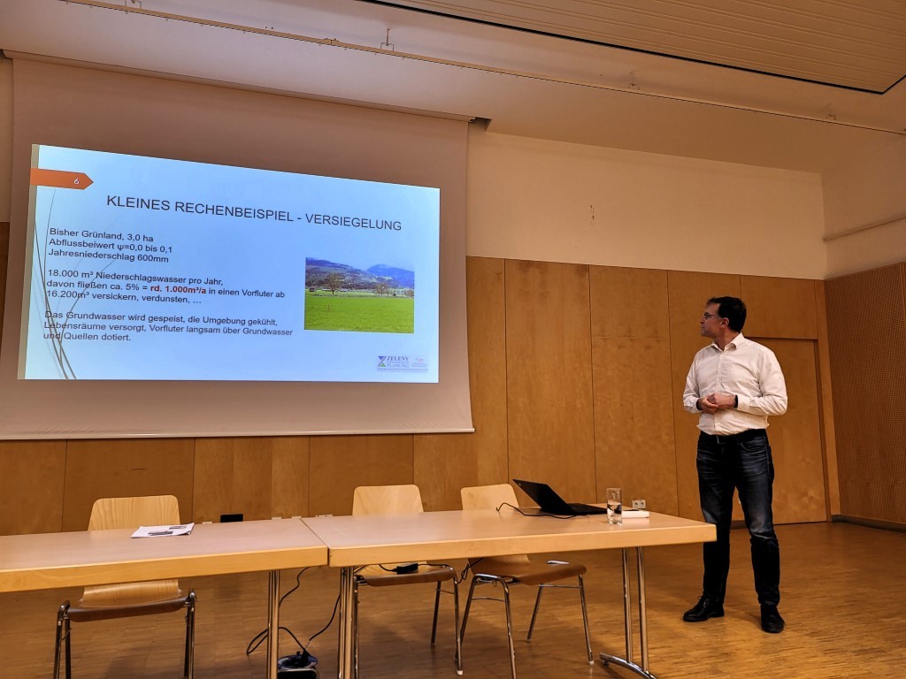 Als Referent konnte der Kulturtechniker Georg Zeleny gewonnen werden. Er informierte über verschiedene Möglichkeiten zur Entlastung des Kanalsystems durch die Implementierung grüner Infrastruktur. Dazu zählen einerseits „klassische“ Methoden wie Rasengittersteine sowie Sickermulden und andererseits innovative Zugänge wie wasserdurchlässige Oberflächen, Dachbegrünung, Schwammstadt-Prinzip und DrainGarden-System. Der Vortrag zeichnete sich nicht nur durch grundlegende Information aus, sondern auch durch praxisnahe Information und Umsetzungsbeispiele.